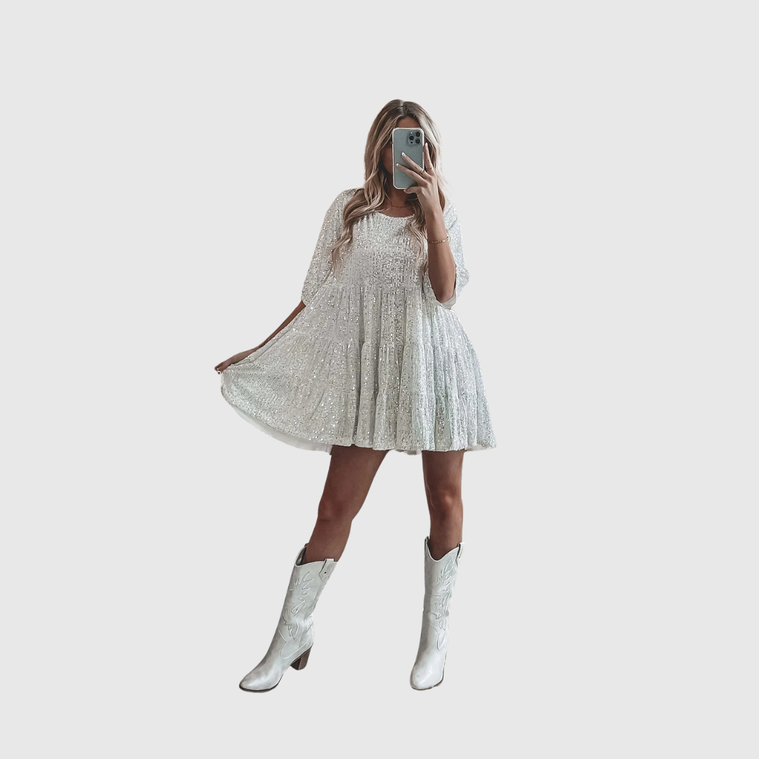 This show-stopping dress features a loose, swing-style silhouette with elbow-length puffed sleeves and a softly flared hemline. Covered in radiant sequins, it sparkles beautifully in motion, making it a standout piece for celebrations. The flowy fit offers graceful movement and all-day comfort without sacrificing glamour or elegance.